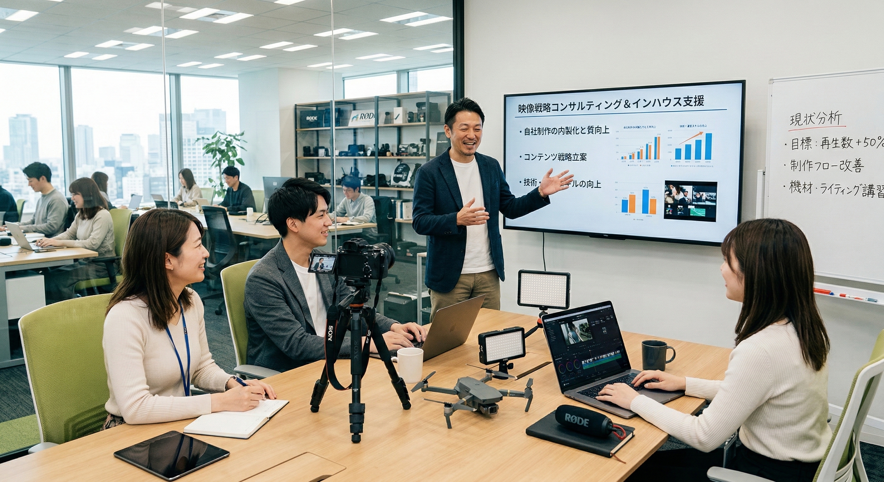 企業の動画制作内製化(インハウス化)をプロの視点から強力にサポート。機材選定から企画の立て方、撮影・編集の技術指導まで、社外のクリエイティブ顧問として貴社の映像部門を育成・強化します。